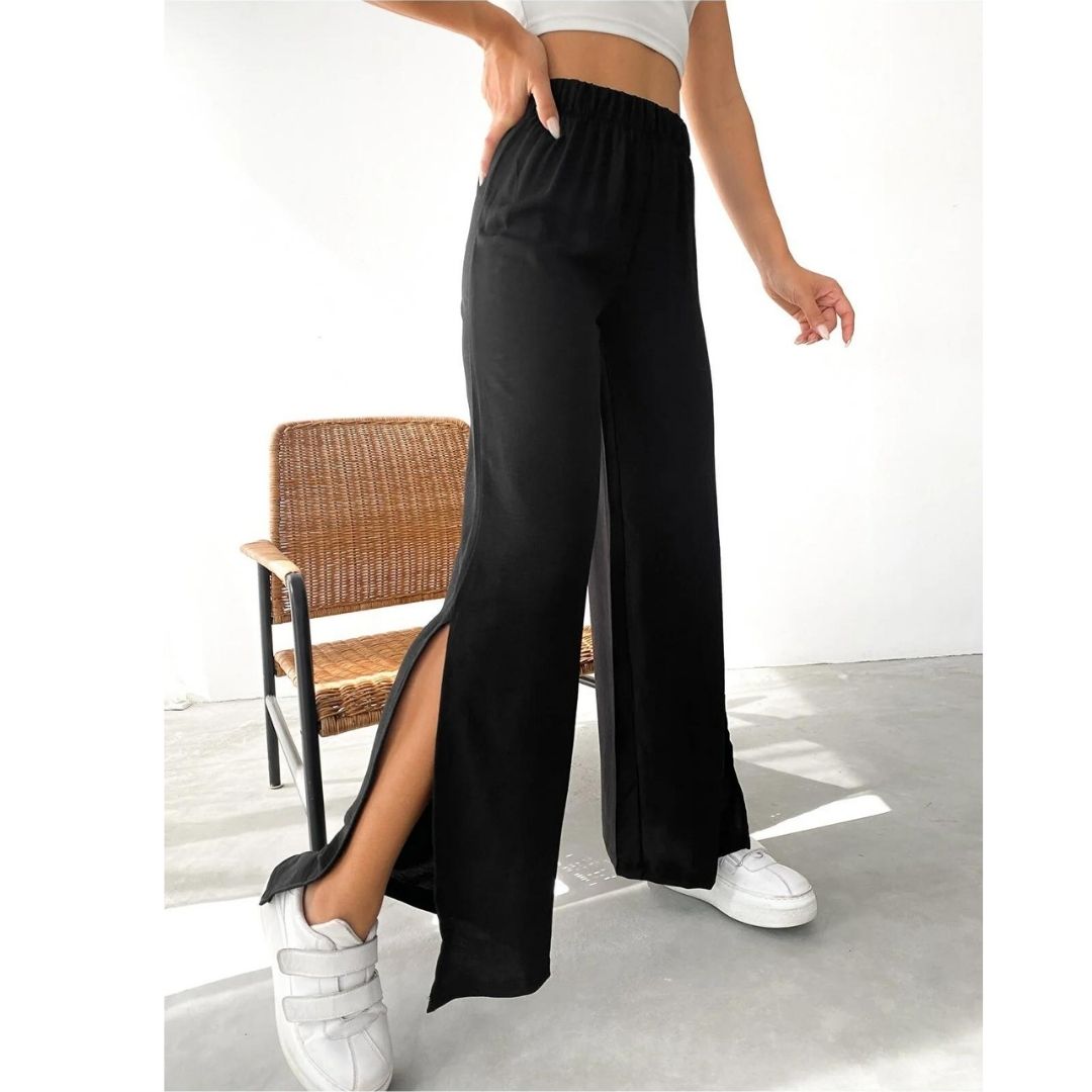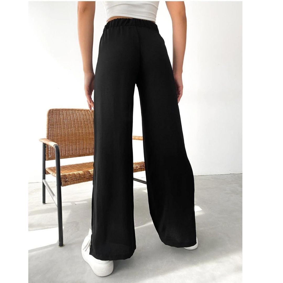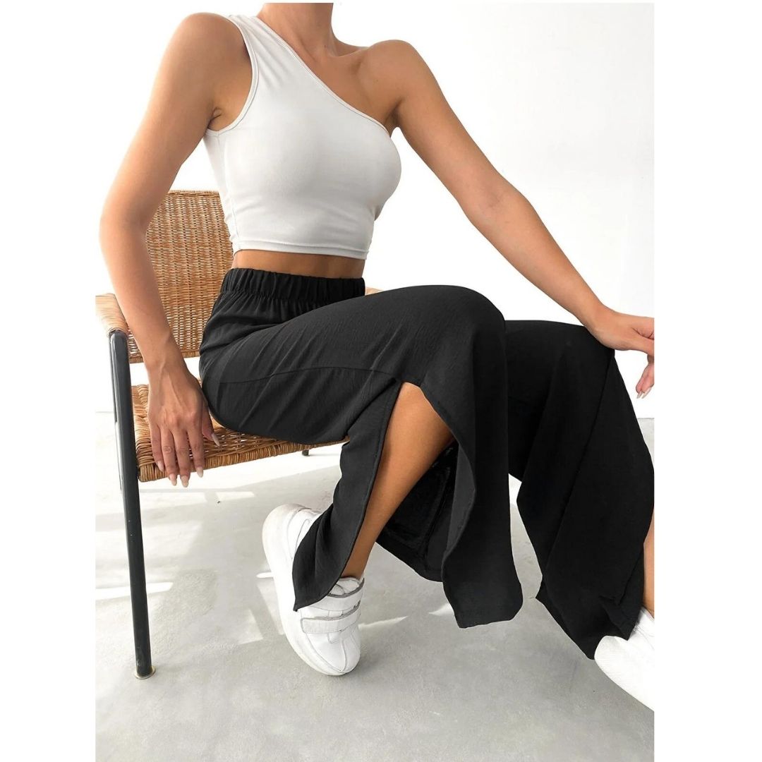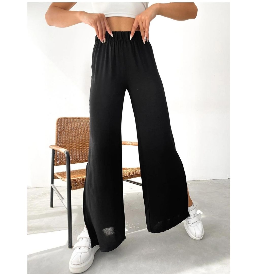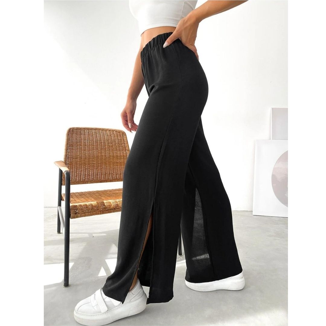 Siyah Renk Beli Lastikli Yanı Yırtmaçlı Palazzo Pantolon